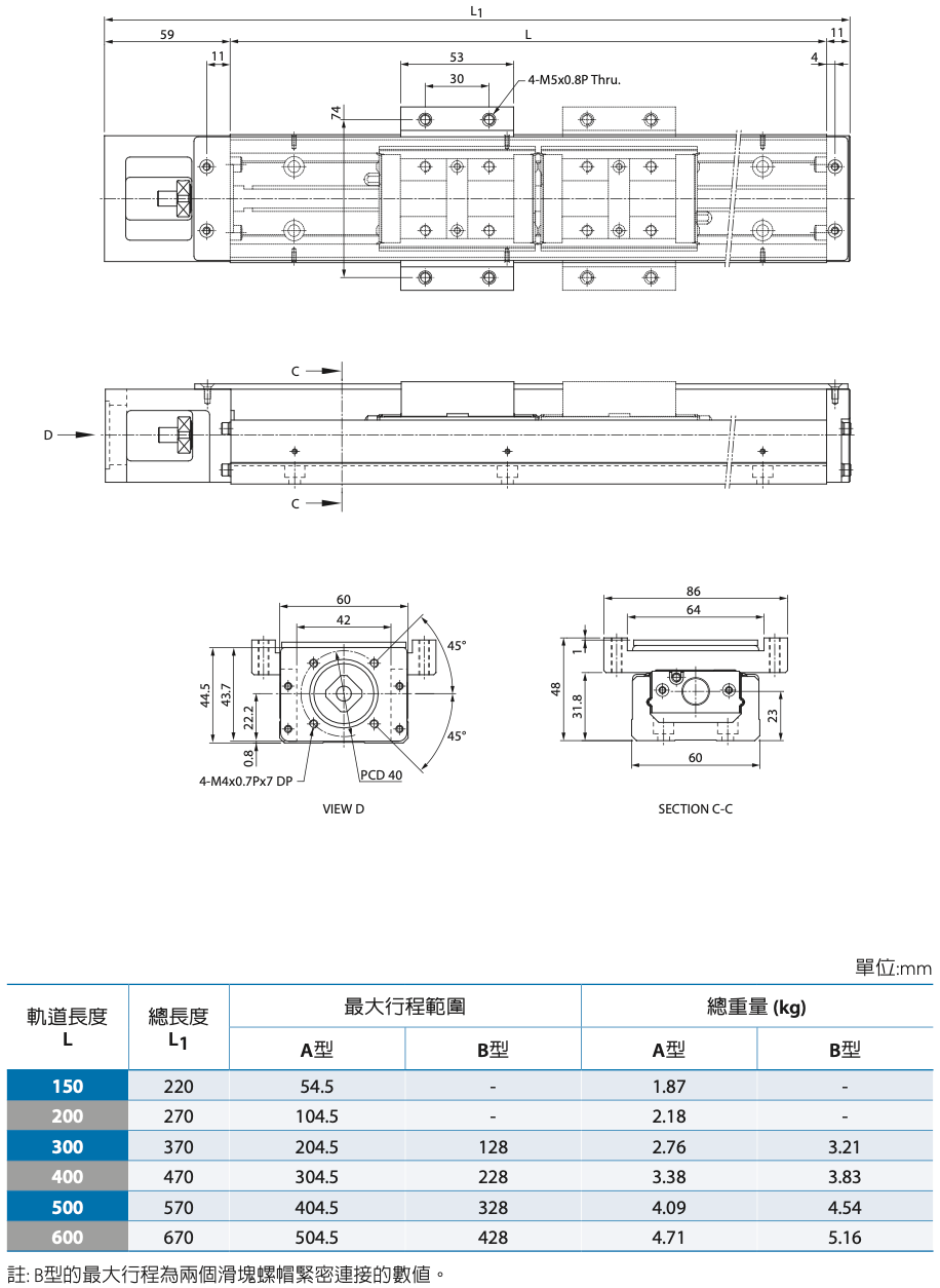 集PMI 線軌與螺桿的技術與經驗,結合螺帽與滑塊的一體化設計,並搭配高剛性的U型軌最佳化斷面,可達到最佳的空間利用及大幅減少安裝的時間,確保其高剛性與高精度的要求,而其鋼珠滾動面採用2列歌德式圓弧及45°接觸角的優越設計,更提供了四方向的負荷能力。