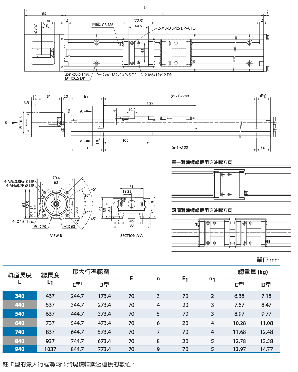 集PMI 線軌與螺桿的技術與經驗,結合螺帽與滑塊的一體化設計,並搭配高剛性的U型軌最佳化斷面,可達到最佳的空間利用及大幅減少安裝的時間,確保其高剛性與高精度的要求,而其鋼珠滾動面採用2列歌德式圓弧及45°接觸角的優越設計,更提供了四方向的負荷能力。