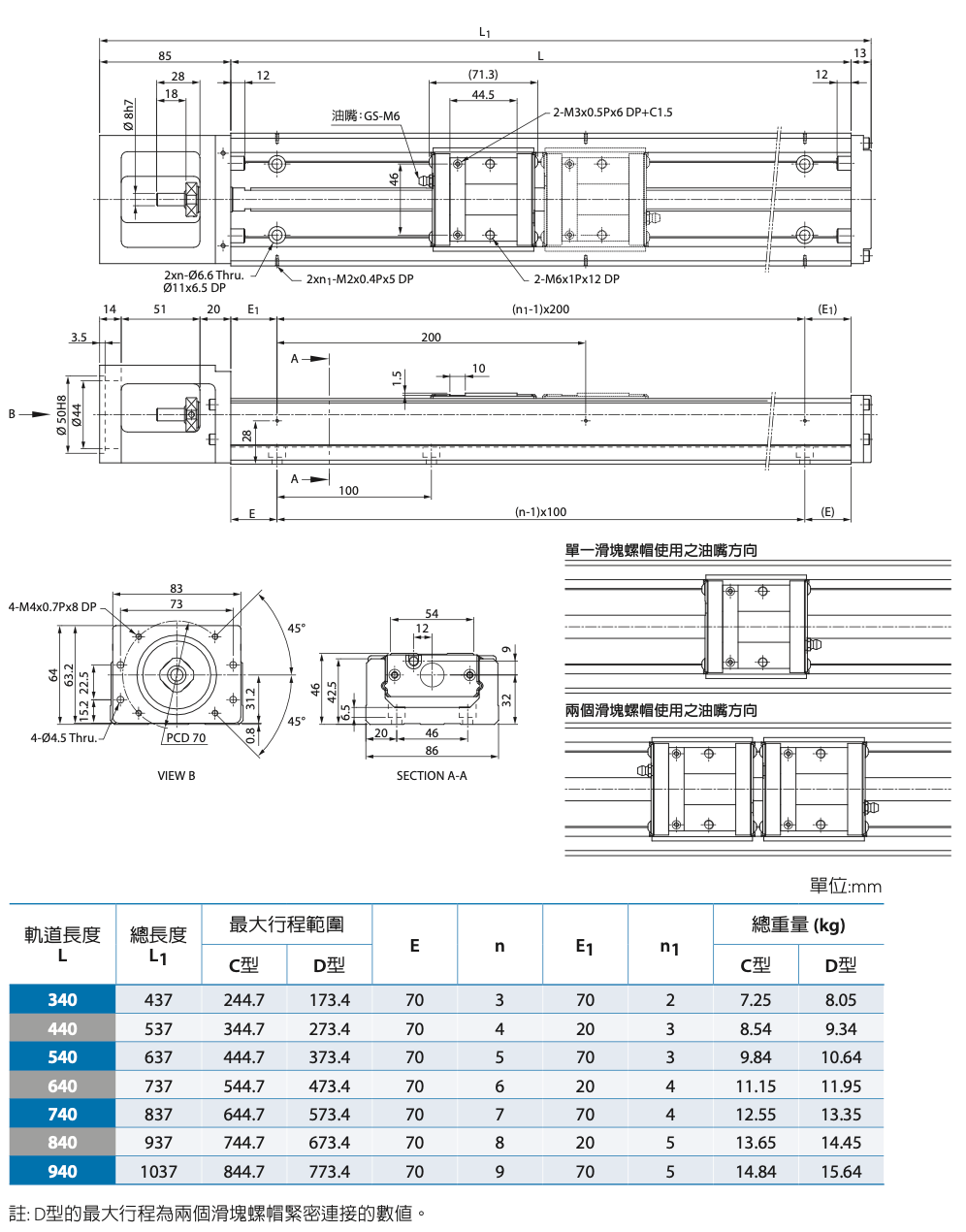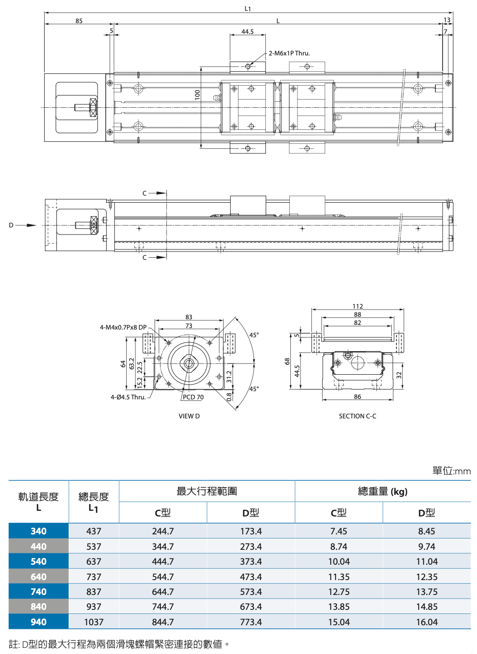 集PMI 線軌與螺桿的技術與經驗,結合螺帽與滑塊的一體化設計,並搭配高剛性的U型軌最佳化斷面,可達到最佳的空間利用及大幅減少安裝的時間,確保其高剛性與高精度的要求,而其鋼珠滾動面採用2列歌德式圓弧及45°接觸角的優越設計,更提供了四方向的負荷能力。