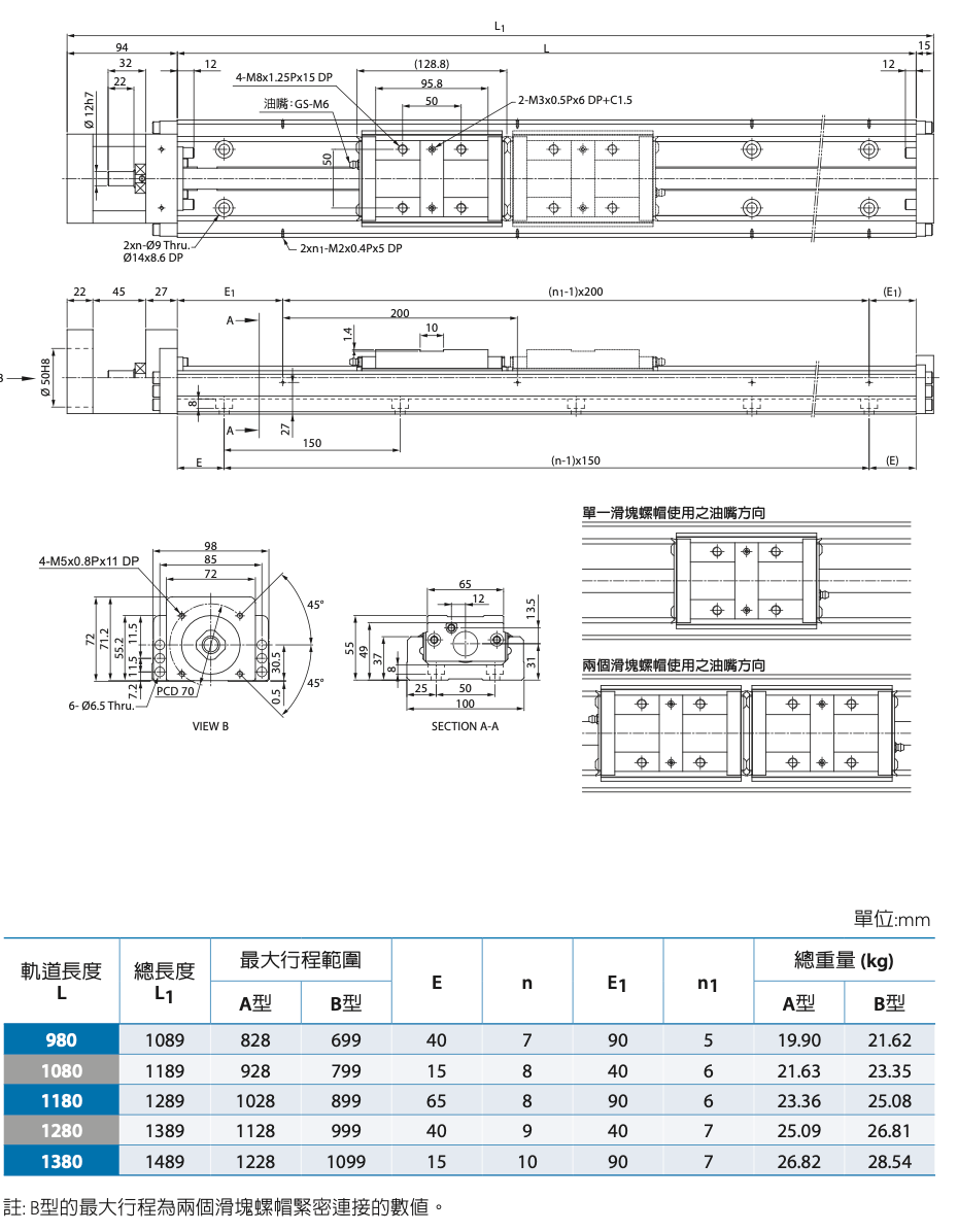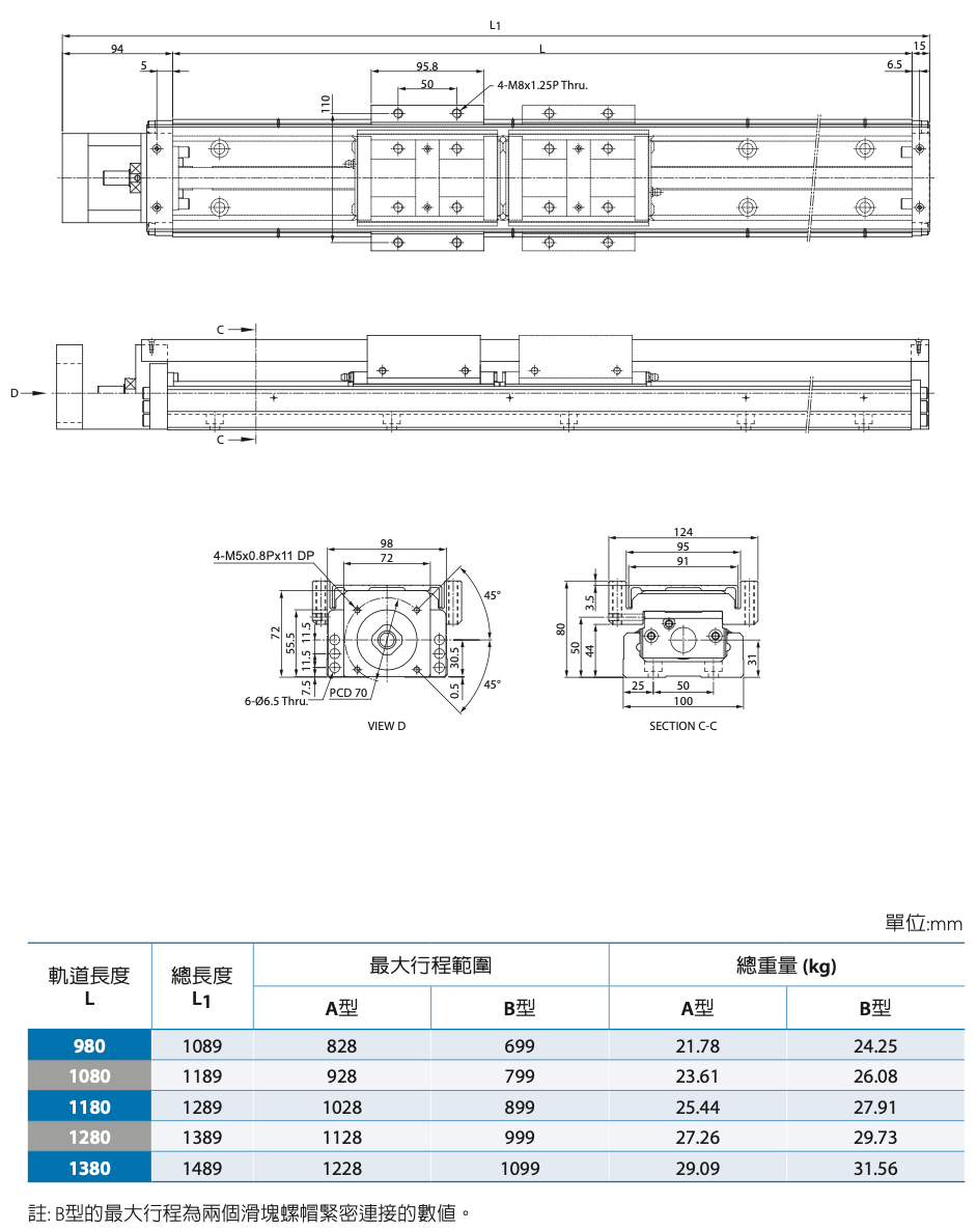 集PMI 線軌與螺桿的技術與經驗,結合螺帽與滑塊的一體化設計,並搭配高剛性的U型軌最佳化斷面,可達到最佳的空間利用及大幅減少安裝的時間,確保其高剛性與高精度的要求,而其鋼珠滾動面採用2列歌德式圓弧及45°接觸角的優越設計,更提供了四方向的負荷能力。