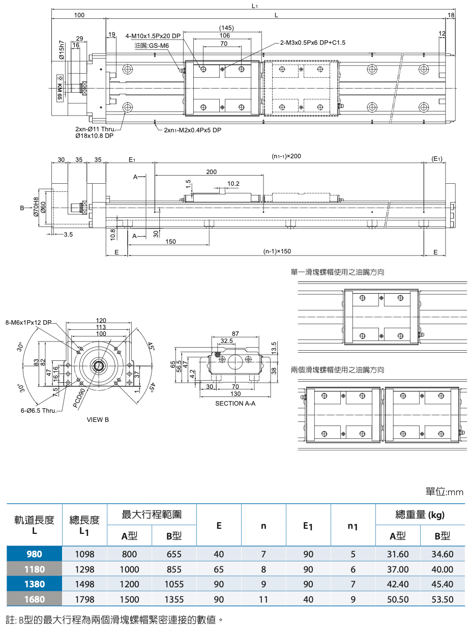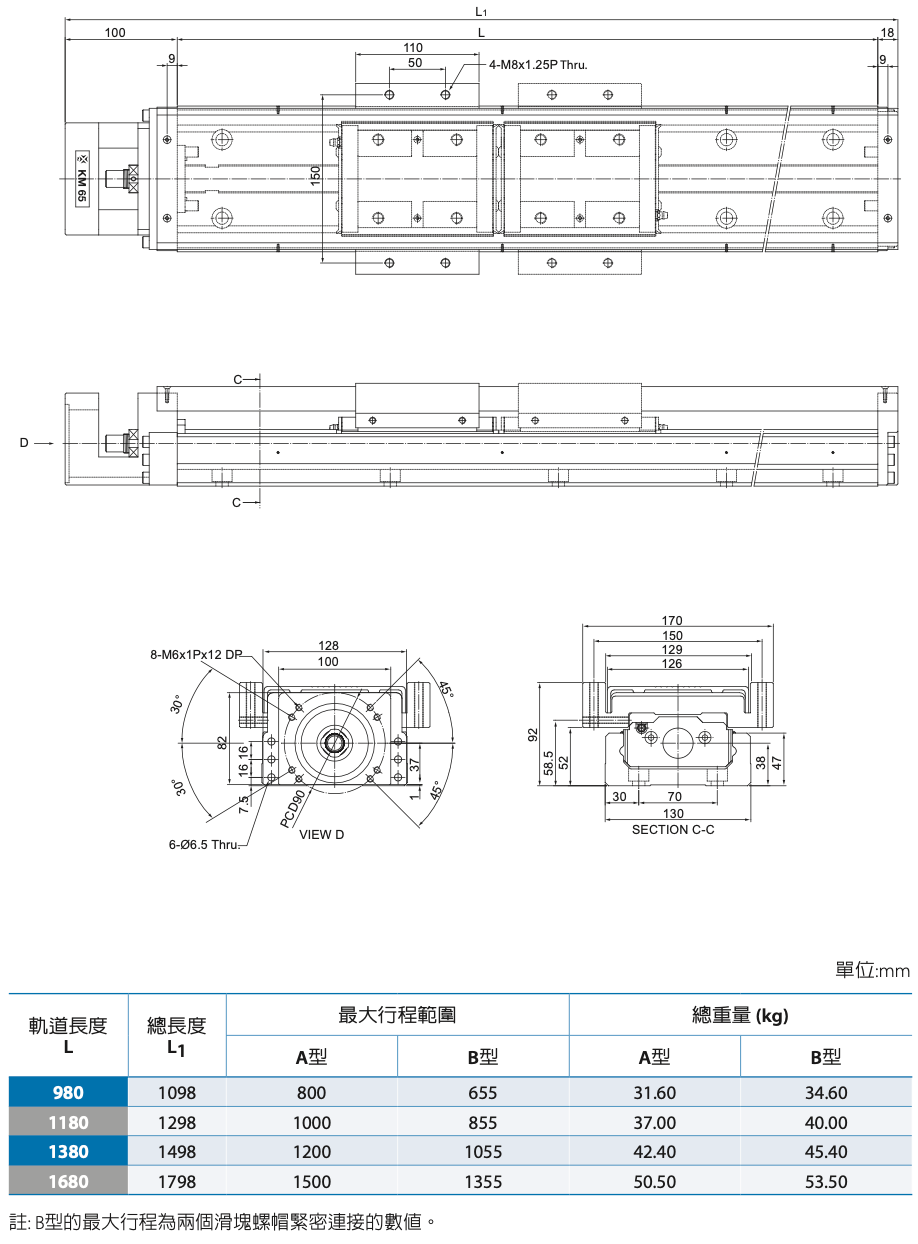 集PMI 線軌與螺桿的技術與經驗,結合螺帽與滑塊的一體化設計,並搭配高剛性的U型軌最佳化斷面,可達到最佳的空間利用及大幅減少安裝的時間,確保其高剛性與高精度的要求,而其鋼珠滾動面採用2列歌德式圓弧及45°接觸角的優越設計,更提供了四方向的負荷能力。