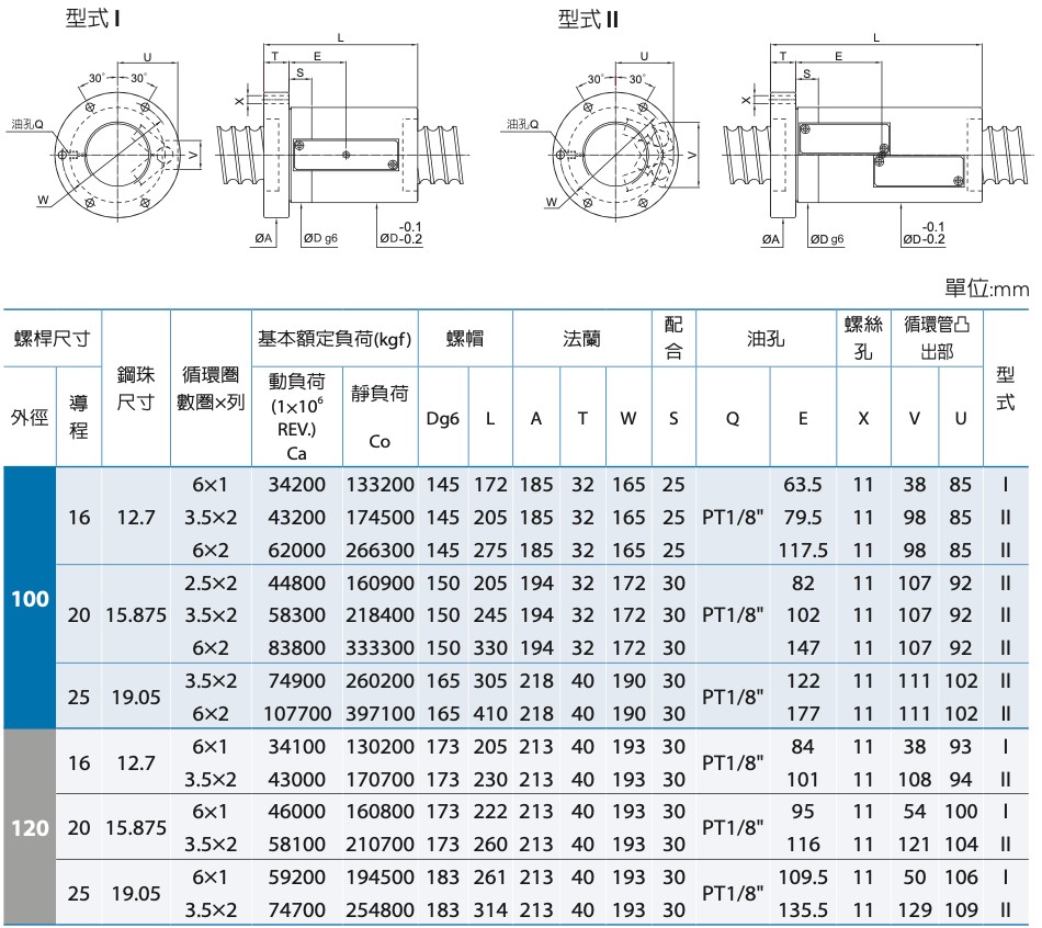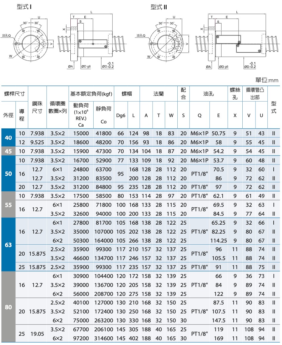PMI 可承製軸Ø40~Ø120mm,導程10~60mm之標準規格。(若有特殊規格需求,請與業務人員接洽)