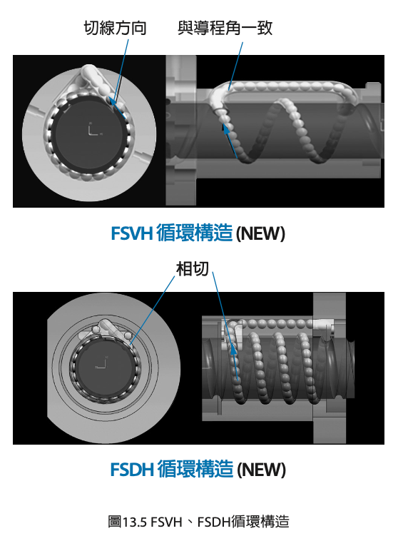 舊型式(FSVC)之循環方式為迴流管垂直插入滾珠溝槽形成一前傾角,滾珠在進入迴流管時會與迴流管撞擊而彈入迴流管,FSVH系列之循環構造由切線方向進入迴流管,與導程角方向一致可順暢進入迴流管,可提高循環構造之使用壽命。