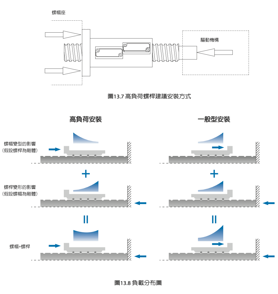 為了使螺桿軸、螺帽承受軸向均一負荷,在使用上建議採用如圖13.7所示的安裝方式,可以避免螺桿軸、螺帽及鋼珠過度的磨耗及運轉時受力不均造成振動,有效提升滾珠螺桿的使用壽命。
