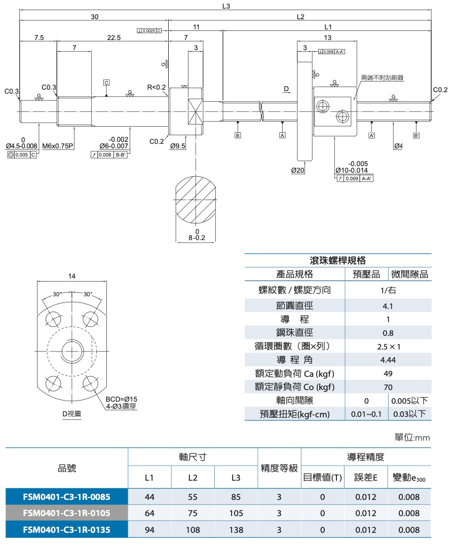 FSMC 軸徑Ø4 導程01|尺寸規格表