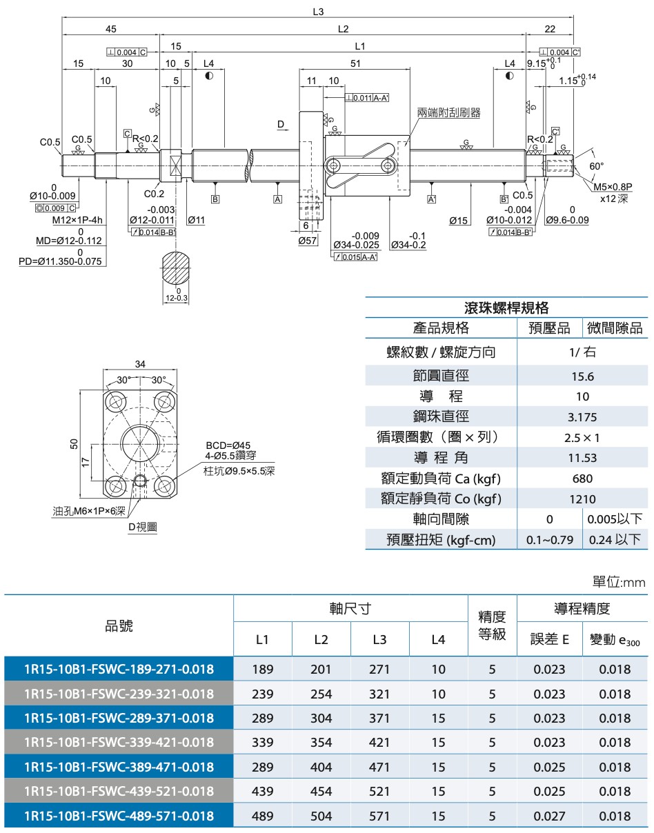 FSWC 軸徑Ø15 導程10|尺寸規格表