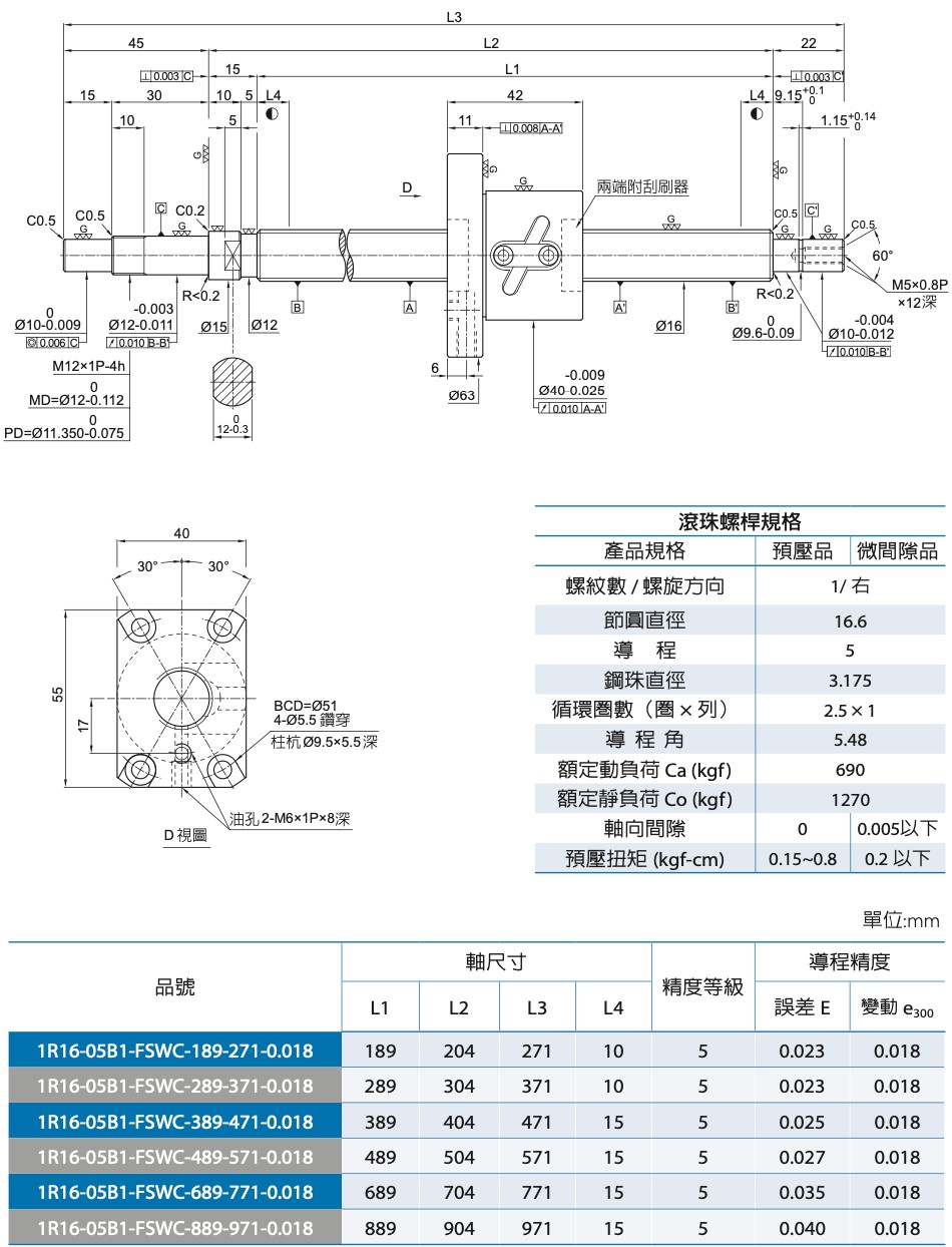 FSWC 軸徑Ø16 導程05|尺寸規格表