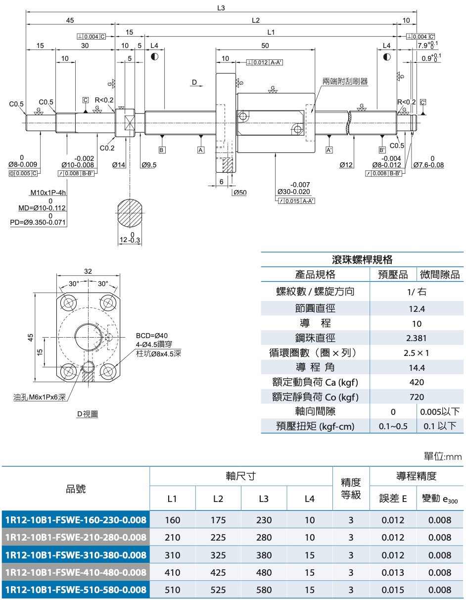 FSWE 軸徑Ø12 導程10|尺寸規格表