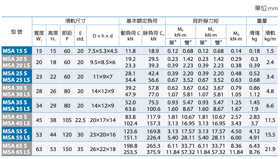 MSA系列線性滑軌採用4列圓弧接觸式及45°觸角的鋼珠列設計,提供徑向、反徑向及橫方向四方向的相同額定負荷能力,無論X、Y、Z等軸的各種安裝方式都可以使用,並且可在維持低摩擦阻力情況下均勻的施以預壓,增強四個受力方向的剛性,特別適合高精度與高負荷的運動方式。