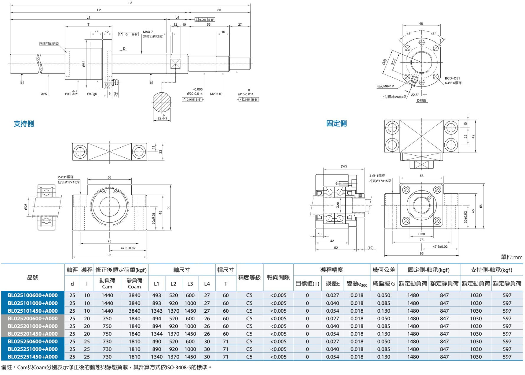 軸徑Ø25 導程10,20,25|尺寸規格表