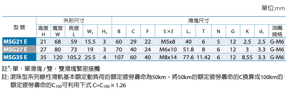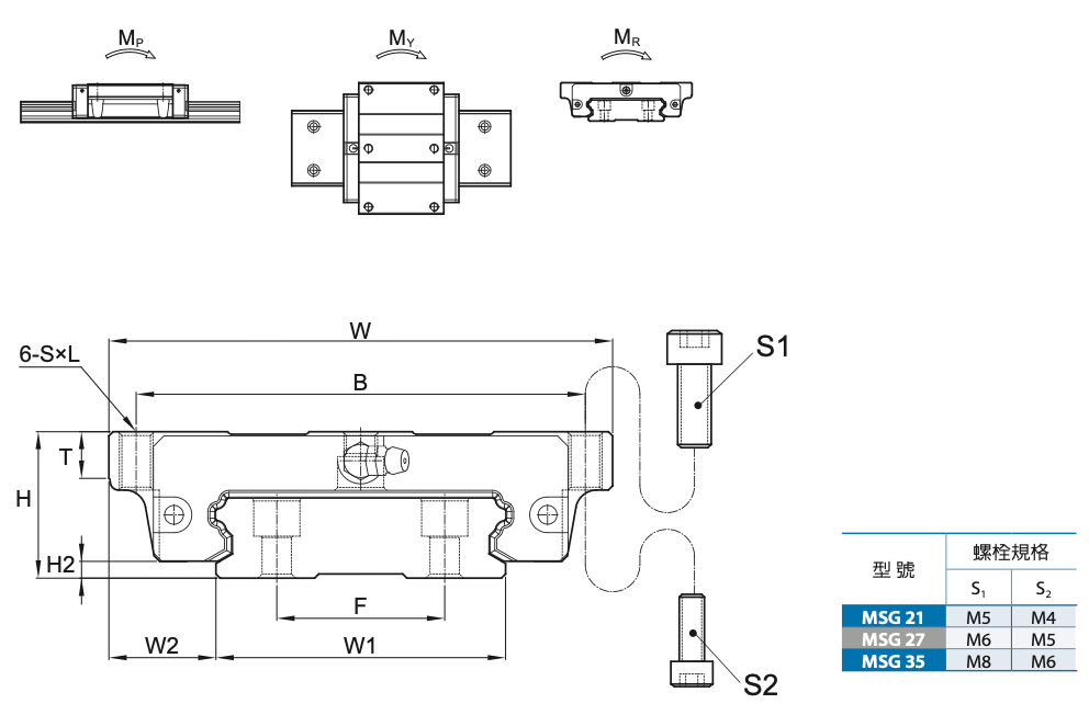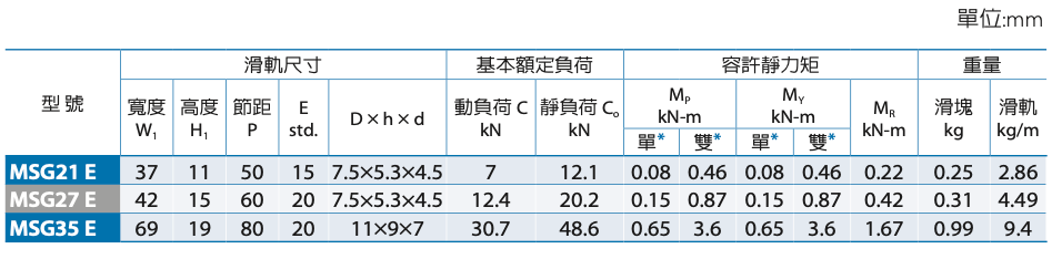 MSG系列線性滑軌採用4列圓弧接觸式及45°接觸角的鋼珠列設計,提供徑向、反徑向及橫方向四方向的相同額定負荷能力,無論X、Y、Z等軸的各種安裝方式都可以使用,並且可在維持低摩擦阻力情況下均勻的施以預壓,增強四個受力方向的剛性,特別適合高精度與高負荷的運動方式,而設計上增大滑軌寬度並降低組合高度,在高力矩與有限空間場合下,可採用單軸配置使用。