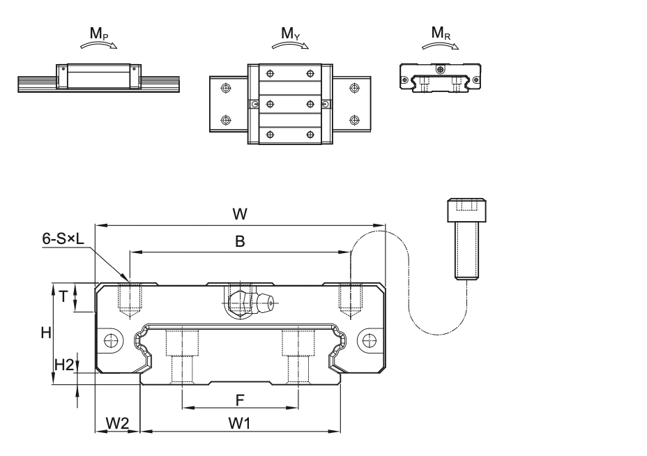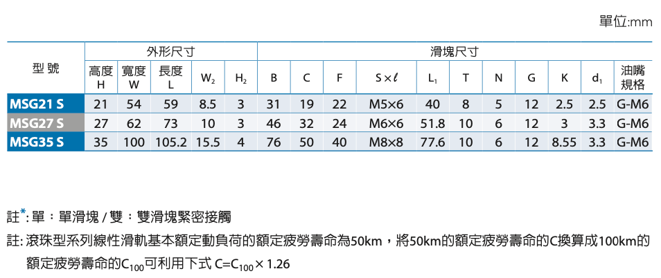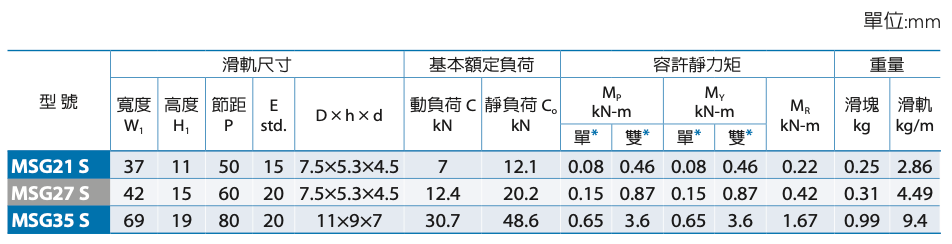 MSG系列線性滑軌採用4列圓弧接觸式及45°接觸角的鋼珠列設計,提供徑向、反徑向及橫方向四方向的相同額定負荷能力,無論X、Y、Z等軸的各種安裝方式都可以使用,並且可在維持低摩擦阻力情況下均勻的施以預壓,增強四個受力方向的剛性,特別適合高精度與高負荷的運動方式,而設計上增大滑軌寬度並降低組合高度,在高力矩與有限空間場合下,可採用單軸配置使用。