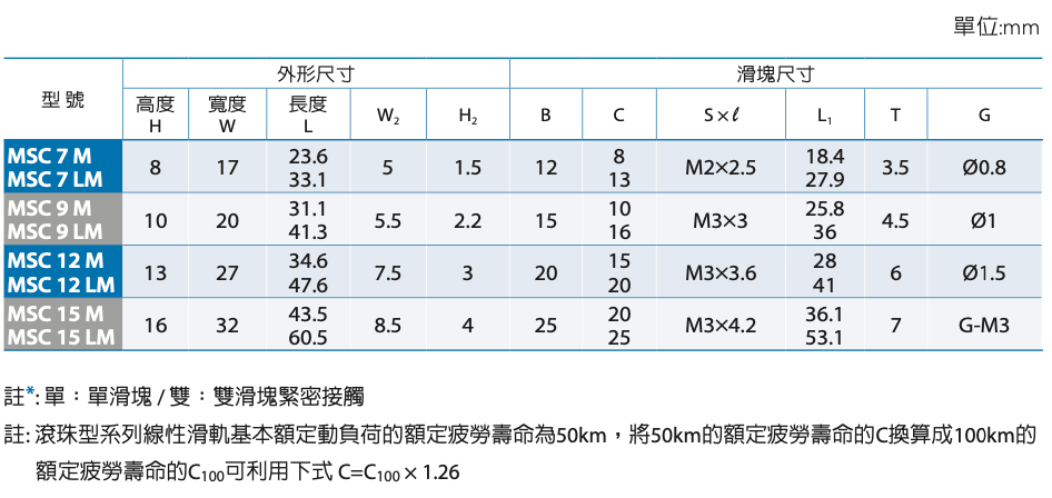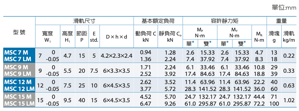 MSC標準型和MSD寬幅型不鏽鋼系列線性滑軌採用2列歌德圓弧接觸式及45°接觸角的鋼珠設計,提供徑向、反徑向及橫方向四方向的相同額定負荷能力,無論X、Y、Z等軸的各種安裝方式都可以使用。超小型化與低摩擦阻力的設計,適合小型化設備使用。