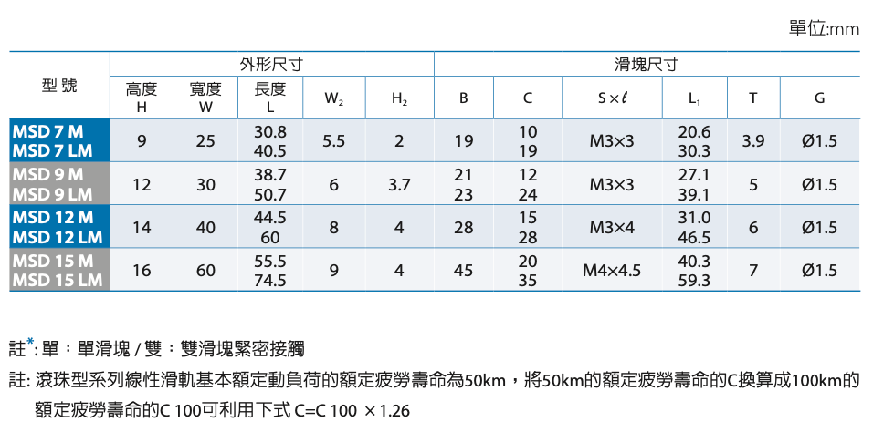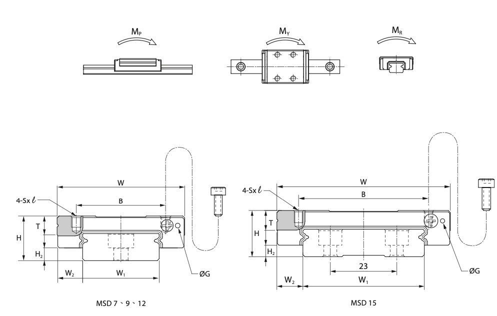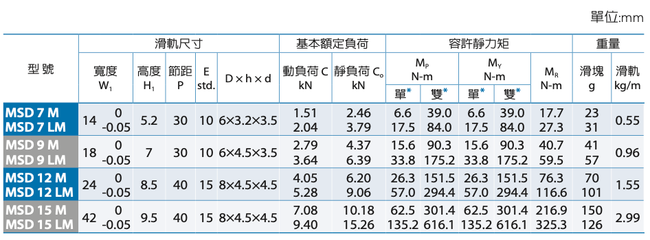 MSC標準型和MSD寬幅型不鏽鋼系列線性滑軌採用2列歌德圓弧接觸式及45°接觸角的鋼珠設計,提供徑向、反徑向及橫方向四方向的相同額定負荷能力,無論X、Y、Z等軸的各種安裝方式都可以使用。超小型化與低摩擦阻力的設計,適合小型化設備使用。